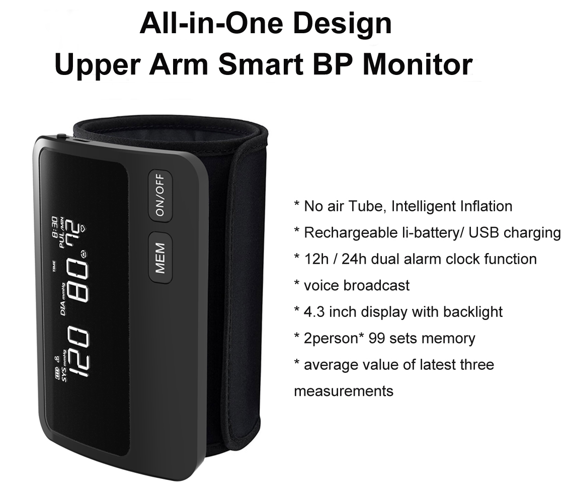 3. Built-in High-capacity Rechargeable Lithium Battery400mAh It can be charged with USB charging. It can be used for many times on a single full charge. No worries about frequent battery replacement. 4. Large 4.3inchScreen with Backlit Display More clear vision and friendly for all age of users. 5. Easy to Use with One-button Operation and Voice Broadcast The voice function can be turned off if you don't need it.Suitable for the seniors and people with poor vision. 6. Intelligent Inflation Technology Intelligent inflation technology is used to avoid discomfort caused by the sudden change of pressure and ensures a comfortable measurement.